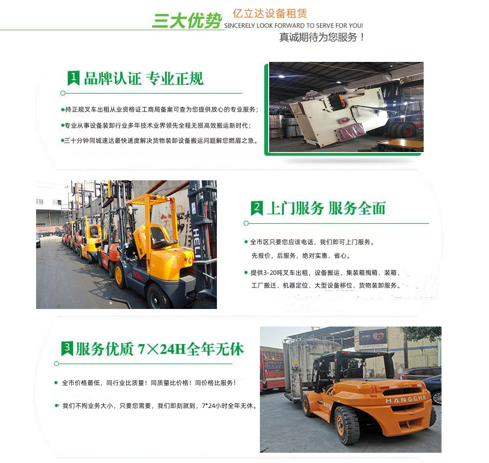 亿立达设备租赁有限公司是工商局准许的北京体育职业学院专业叉车出租公司,公司本着诚信、服务、效率、创新的经营理念,用精湛的技术,真诚的服务,为众多客户提供优质的服务,同时获得信赖与支持。专业提供北京体育职业学院3-20吨叉车出租、叉车租赁、设备搬运、集装箱掏箱装箱、机器移位定位、货物装卸、工厂搬迁、安全可靠,收费透明,价格便宜,随叫随到,24小时上门服务!本公司叉车吊车师傅对各种设备搬运装卸都有深刻探讨和研究。很多的疑难设备搬运,通过我公司的叉车师傅都能迎刃而解。对各种进口设备、国产机器、大型设备搬迁、高难度搬迁、各种精密仪器、医疗设备、科研设备等都能搬运; 提供全市 24 小时上门装卸搬运服务。同时提供厂房搬迁服务。 ...